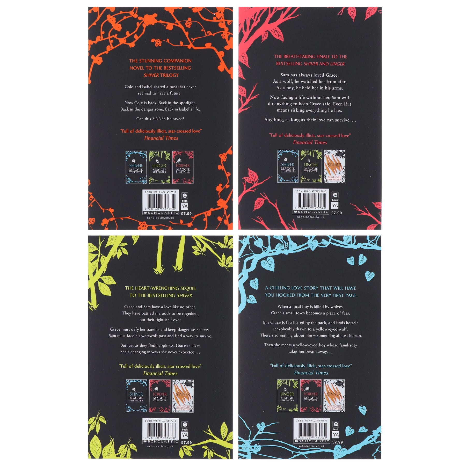 Maggie Stiefvater's Shiver series follows Grace, a teenager who is fascinated by a pack of wolves in her small town. She has been watching the wolves in the woods for years, and there is one she will learn she can't live without. This 4 book set includes Shiver, Linger, Forever and Sinner perfect for young adults and is a must for any Twilight and fantasy lovers.